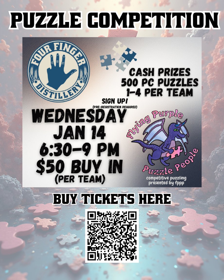 Four Finger Distillery Indy is teaming up with Flying Purple Puzzle People to bring you a night of competitive puzzling, cocktails, and total brain-powered chaos — in the best way possible.