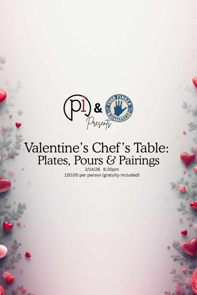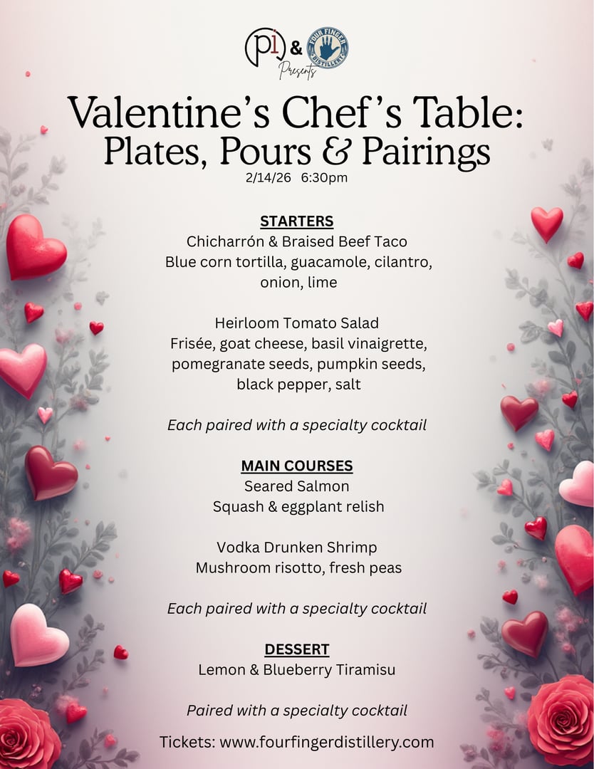 Celebrate Valentine’s Day with a chef-driven five-course dining experience, where each course is paired with a handcrafted cocktail designed to elevate every bite. This intimate evening showcases the culinary artistry of Pi Indy alongside the spirit-forward creativity of Four Finger Distillery.